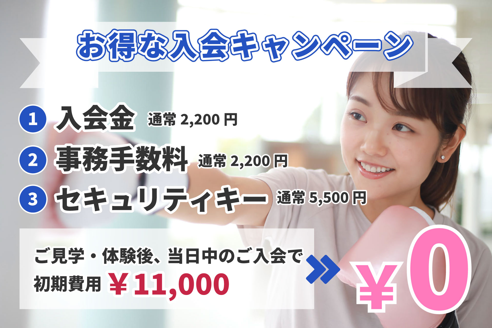 ご見学・体験後、当日中のご入会で!! ・入会金 通常2,200円 ・事務手数料 通常3,300円 ・セキュリティキー 通常5,00円 上記の初期費用11,000円が【0円】になります!